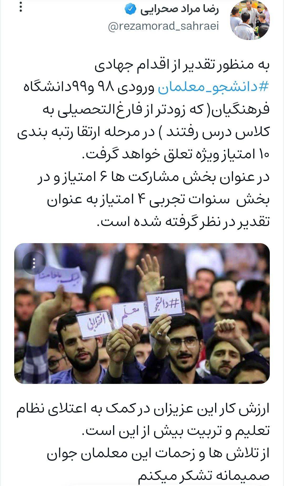 وزیر آموزش و پرورش در صفحه‌ ویراستی خود از اختصاص ۱۰ امتياز ویژه در مرحله ارتقا رتبه بندی برای دانشجومعلمان ورودی ۹۸ و ۹۹ دانشگاه‌ فرهنگیان که زودتر از زمان فارغ‌التحصیلی سرکلاس درس رفته‌اند، خبر داد.