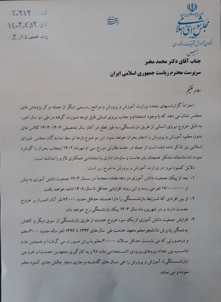 رئیس کمیسیون آموزش، تحقیقات و فناوری مجلس شورای اسلامی طی نامه‌ای خطاب به سرپرست ریاست جمهوری، دلایل کمبود معلم در مدارس را تشریح و راهکارهای جبران این کمبود را مطرح کرد.