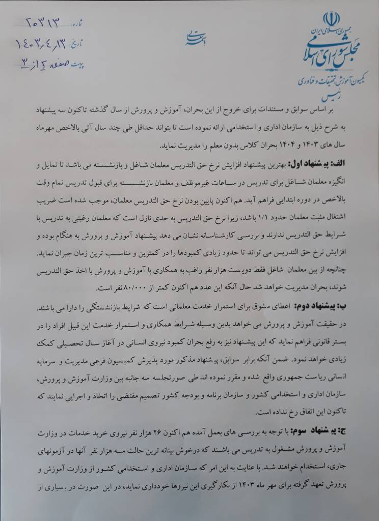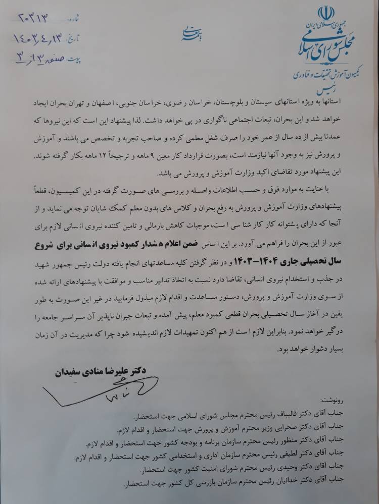 با عنایت به موارد فوق و حسب اطلاعات واصله و بررسی‌های صورت گرفته در این کمیسیون قطعاً پیشنهادهای وزارت آموزش و پرورش به رفع بحران و کلاس‌های بدون معلم کمک شایان توجه می نماید و از آنجا که دارای پشتوانه کار کارشناسی است موجبات کاهش بار مالی و تامین کننده نیروی انسانی لازم برای عبور از این بحران را فراهم می آورد بر این اساس ضمن اعلام هشدار کمبود نیروی انسانی برای شروع سال تحصیلی جاری ۱۴۰۴-۱۴۰۳ و در نظر گرفتن کلیه مساعدتهای انجام یافته دولت رئیس جمهور شهید در جذب و استخدام نیروی انسانی تقاضا دارد نسبت به اتخاذ تدابیر مناسب و موافقت با پیشنهادهای ارائه شده از سوی وزارت آموزش و پرورش دستور مساعدت و اقدام لازم مبذول فرمایید در غیر این صورت به طور یقین در آغاز سال تحصیلی بحران قطعی کمبود معلم پیش آمده و تبعات جبران ناپذیر آن سراسر جامعه را درگیر خواهد نمود. بنابراین لازم است از هم اکنون تمهیدات لازم اندیشیده شود چرا که مدیریت در آن زمان بسیار دشوار خواهد بود.